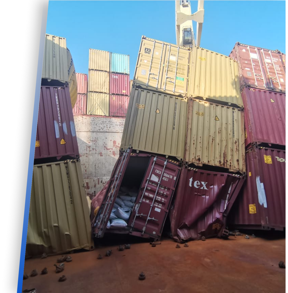 Realizamos inspección de contenedores y sus cargas en todas sus etapas, incluyendo revisión pre-embarque, procesos de consolidación y desconsolidación, y evaluación post-daño, para determinar su condición estructural, operativa y de la carga.